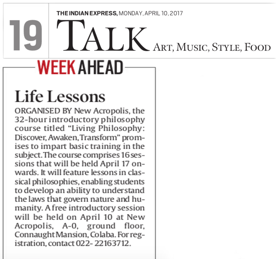 The Indian Express wrote about our flagship course “Living Philosophy – Discover Awaken Transform” on 10th April 2017