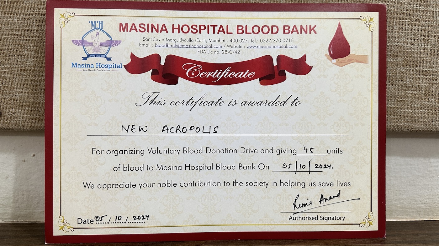 New Acropolis Mumbai Hosts Blood Donation Drive Kurush Dordi2024-10-13T06:06:30+05:30October 5th, 2024|Mumbai, Mumbai Photos| Share This Event! FacebookXRedditLinkedInWhatsAppTumblrPinterestVkXingEmail Related Posts Celebrating Winter Solstice Gallery Celebrating Winter Solstice December 23rd, 2025 | 0 Comments New Acropolis Mumbai Celebrates Day of the Arts 2025 Gallery New Acropolis Mumbai Celebrates Day of the Arts 2025 June 21st, 2025 | 0 Comments A Vibrant Summer Solstice Celebration Gallery A Vibrant Summer Solstice Celebration June 17th, 2025 | 0 Comments Wisdom of Nature! Learn, Connect, Grow : Celebrating Mother Earth Day 2025 Gallery Wisdom of Nature! Learn, Connect, Grow : Celebrating Mother Earth Day 2025 May 4th, 2025 | 0 Comments Celebrating the Spirit of Spring Gallery Celebrating the Spirit of Spring April 1st, 2025 | 0 Comments Traveling Beyond Explorations : Philosophical Journey to Ancient Egypt Gallery Traveling Beyond Explorations : Philosophical Journey to Ancient Egypt December 8th, 2024 | 0 Comments Volunteers Seminar 2024 at Manav Bustan Rural Centre. Gallery Volunteers Seminar 2024 at Manav Bustan Rural Centre. December 7th, 2024 | 0 Comments World Philosophy Day Celebrated by New Acropolis India: Exploring “Building Unity Through Diversity” Gallery World Philosophy Day Celebrated by New Acropolis India: Exploring “Building Unity Through Diversity” November 29th, 2024 | 0 Comments New Acropolis India Turns 18 Gallery New Acropolis India Turns 18 November 5th, 2024 | 0 Comments Invisible Threads: Connecting Ancient Civilizations Through Sculpture Gallery Invisible Threads: Connecting Ancient Civilizations Through Sculpture September 30th, 2024 | 0 Comments