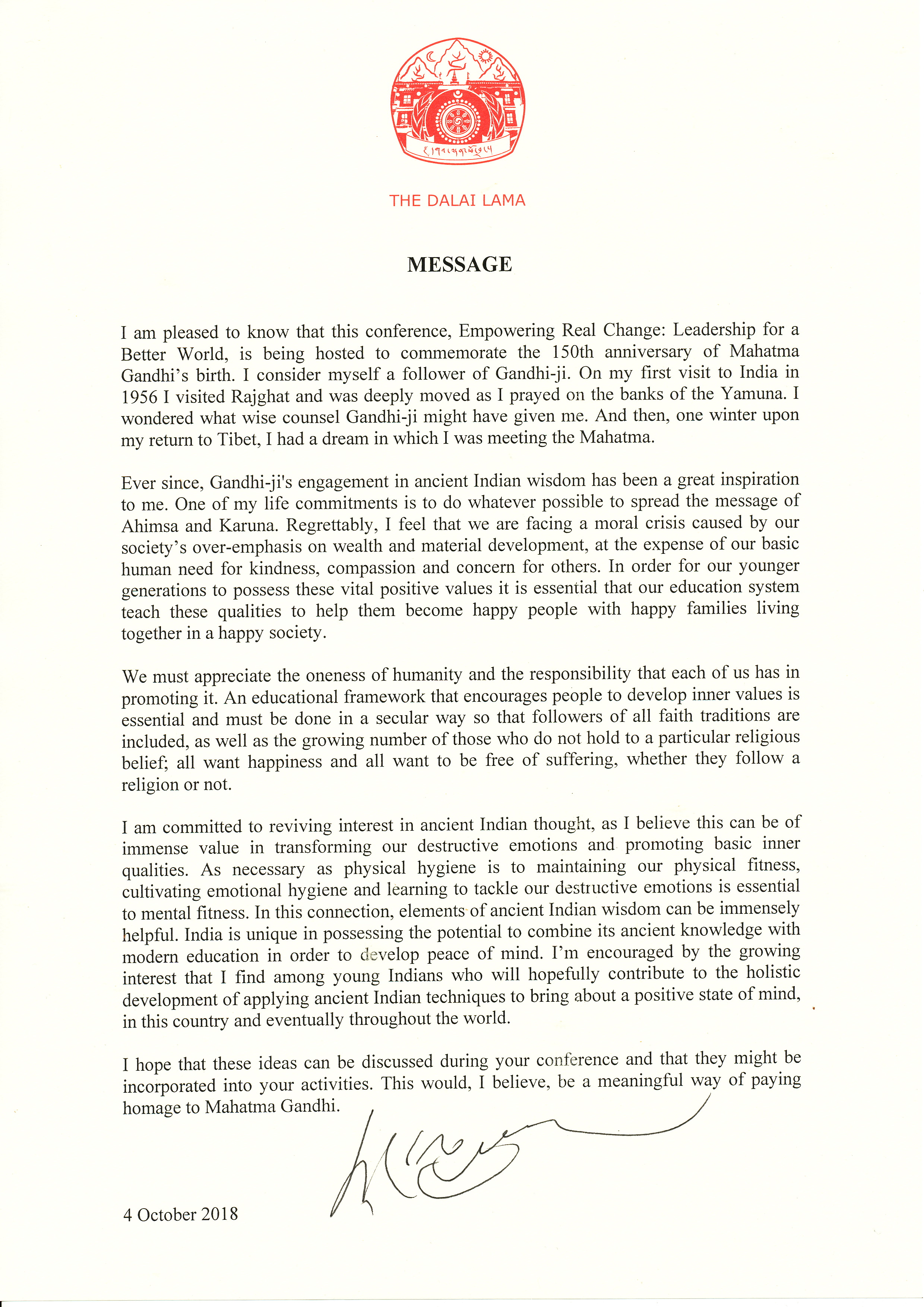 Message of Support from His Holiness the 14th Dalai Lama for our event Empowering Real Change – Leadership for a Better World