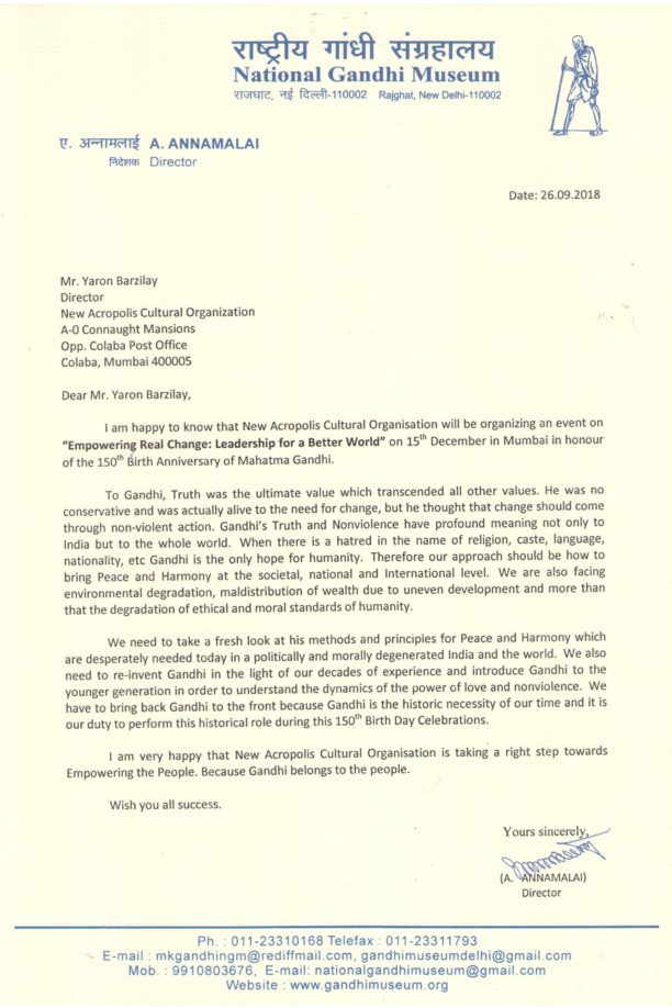 Letter of support from A. Annamalai Director of the National Gandhi Museum for our event Empowering Real Change – Leadership for a Better World