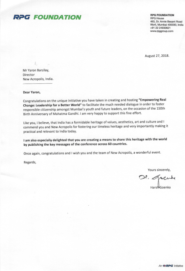 Letter of support from Shri. Harsh Goenka of RPG Foudation for our event Empowering Real Change – Leadership for a Better World