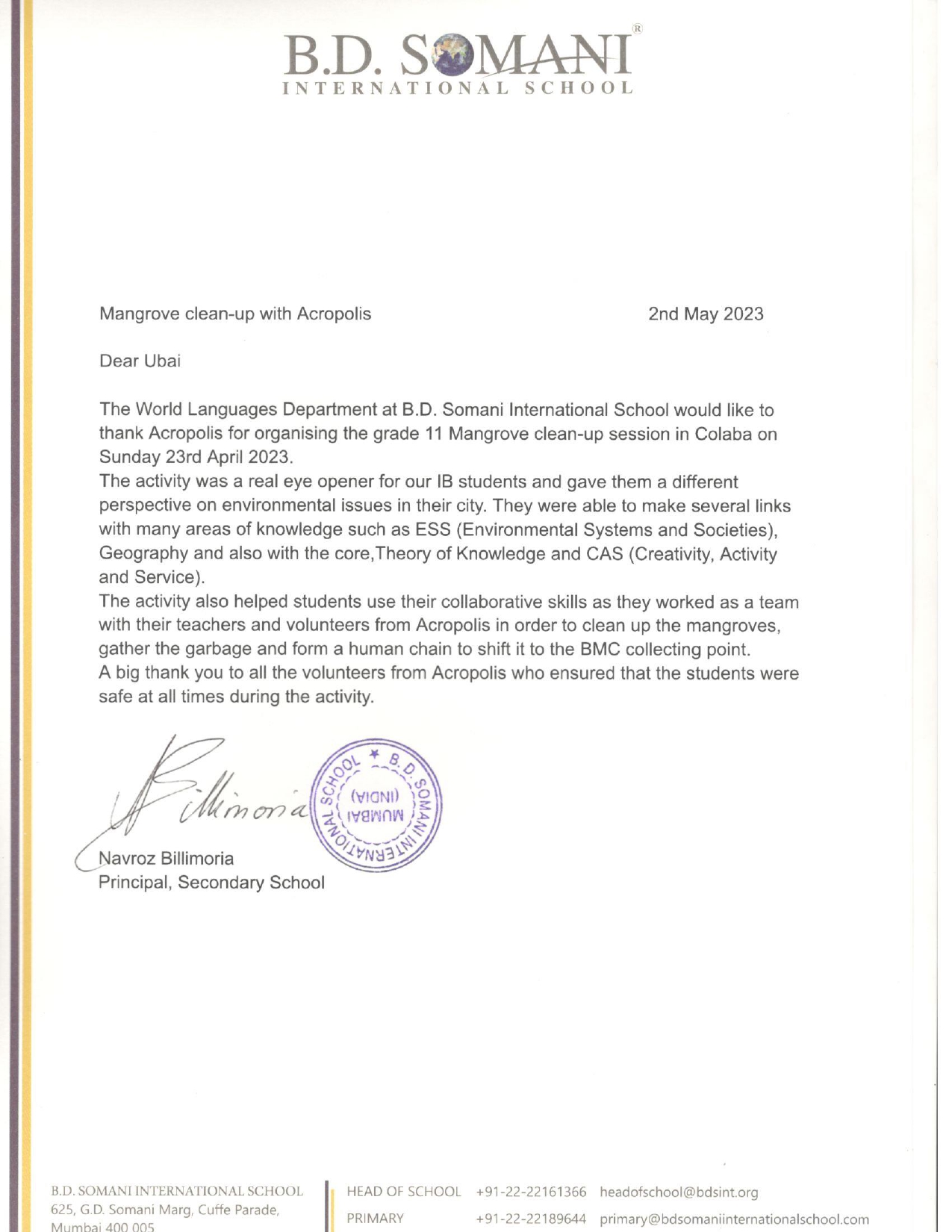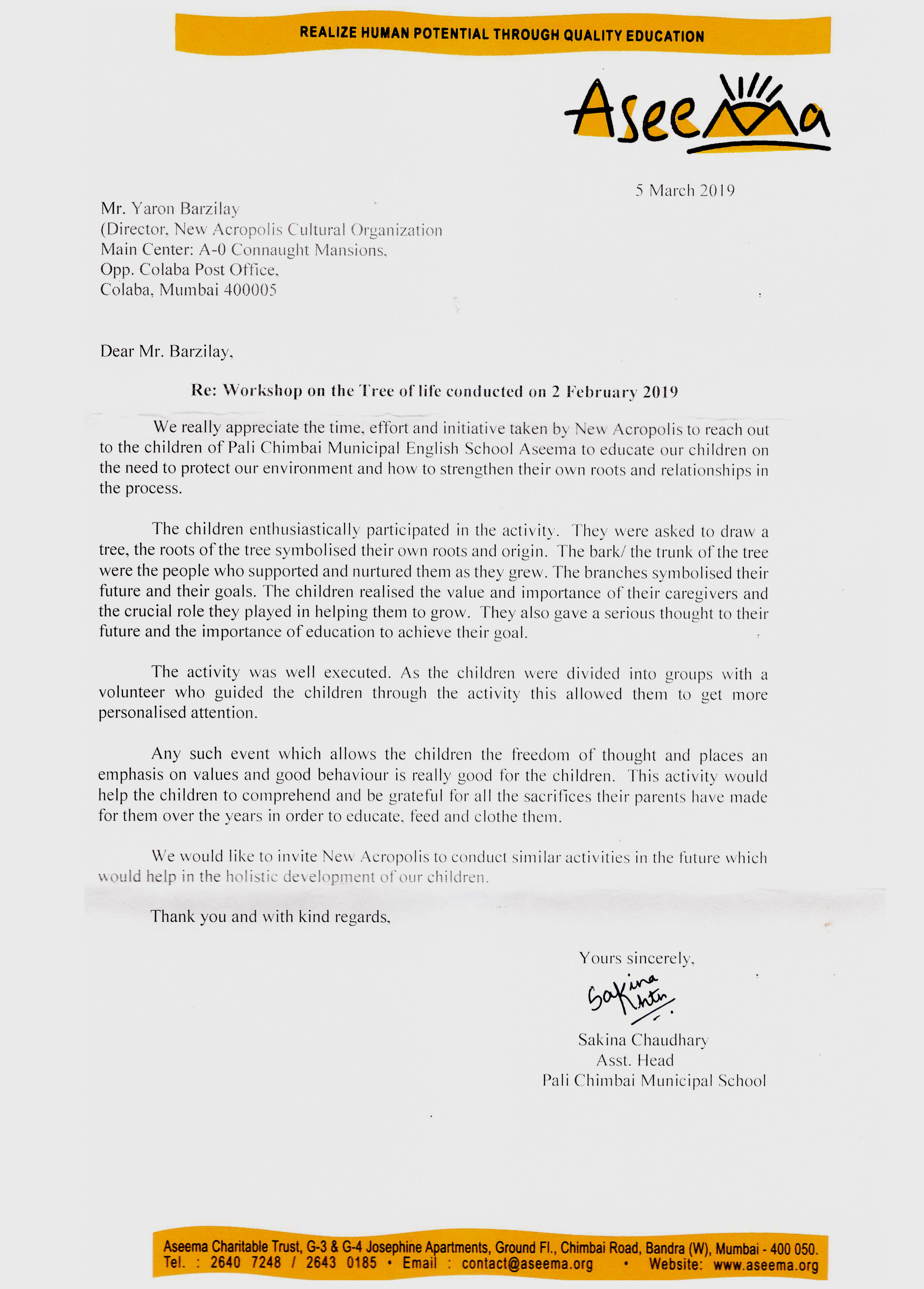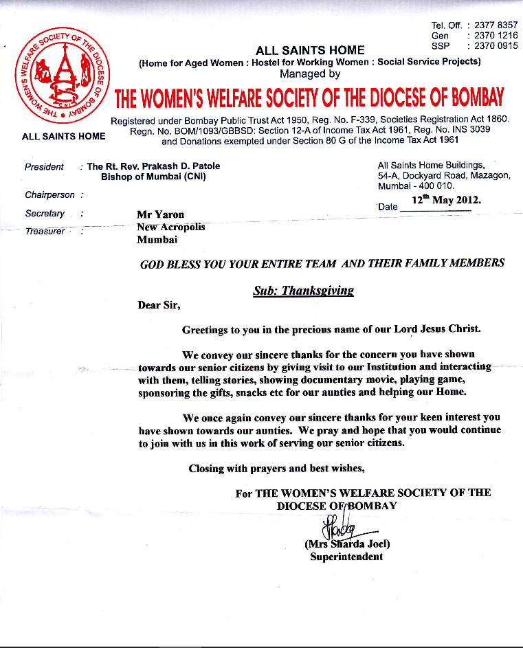 Letter of Support from Smt. Pheroza Godrej for our event Empowering Real Change – Leadership for a Better World