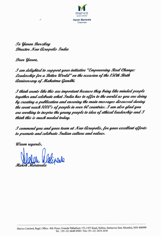 Letter of support from Shri. Harsh Mariwala Chairman of Marico for our event Empowering Real Change – Leadership for a Better World