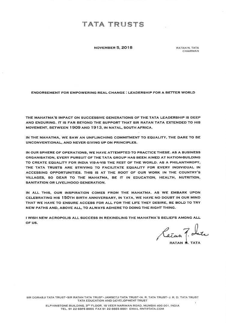 Letter of support from Mr. Ratan Tata Chairman of Tata Trusts for our event Empowering Real Change – Leadership for a Better World